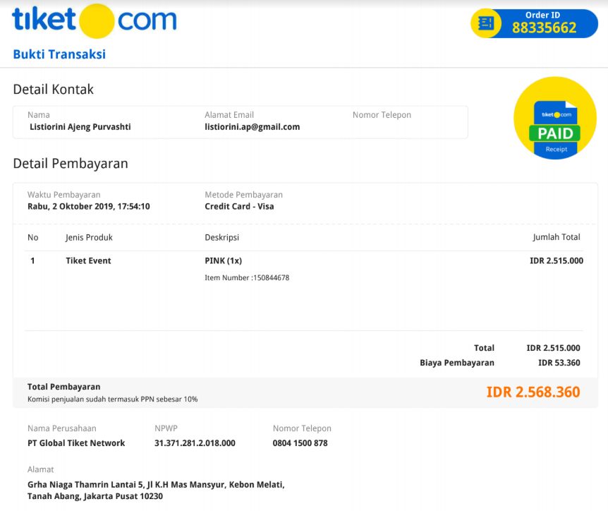 Kalau waktu itu, aku beli tiket sendiri bisa via Tiket.com, tapi kalau fanmeeting DAY 2017 itu cuma bisa beli lewat Indotix. Jadi, setiap acara fanmeeting punya kebijakan yang berbeda, ya. Nah, kalau di Tiket.com, kamu tinggal booking dan langsung transfer sejumlah uang yang tertera di bill-nya. Terus kamu bakal dapet e-tiket, kaya gambar di bawah ini.