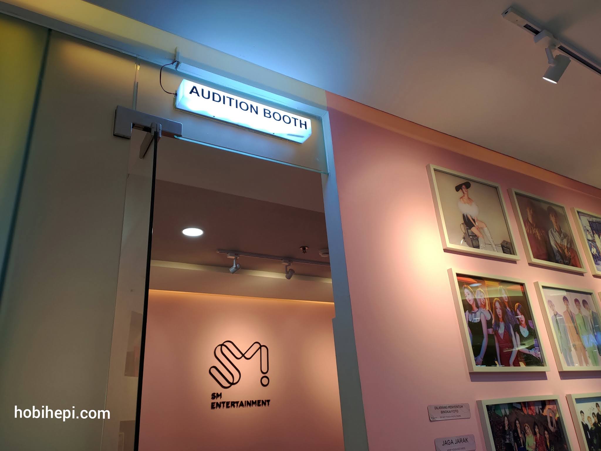 Di bagian depan, langsung terpajang papan bertuliskan “SM ENTERTAINMENT INDONESIA’. Nampak dari luar, ada 6 kursi single sofa berjejer di dalamnya. Warnanya pink dan putih, khas SM banget. Lalu aku juga bisa langsung melihat meja resepsionis yang berlambangkan SM Entertainment.